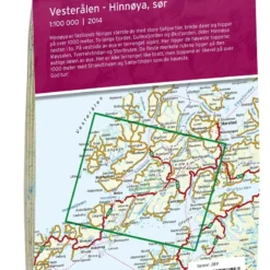 Carte de randonnée et de plein air du sud de l’Archipel des îles Vesterålen. Couvre la zone d’Hinnøya Sør (Sud). Cette zone couvre les 2 longs fjords : Gullesfjorden et le Øksfjorden. Elle permet de visualiser les plus hauts sommets : Møysalen, Tverrelvtindan et Stortinden. Les lieux couverts : Austvågøya, Bognes, Bø, Durmålstinden, Fiskebøl, Gullesfjorden, Hadseløya, Hinnøya, Kaljord, Langøya, Laukvika, Litløy, Lødingen, Melbu, Møysalen nasjonalpark, Ofoten, Raftsundet, Rinøya, Sigerfjord, Skagen, Snøkolla, Sortland, Stokmarknes, Straume, Sørvika, Tjeldsundet, Tjeldøya, Vesterålen, Vesterålsfjorden, Øksfjorden.