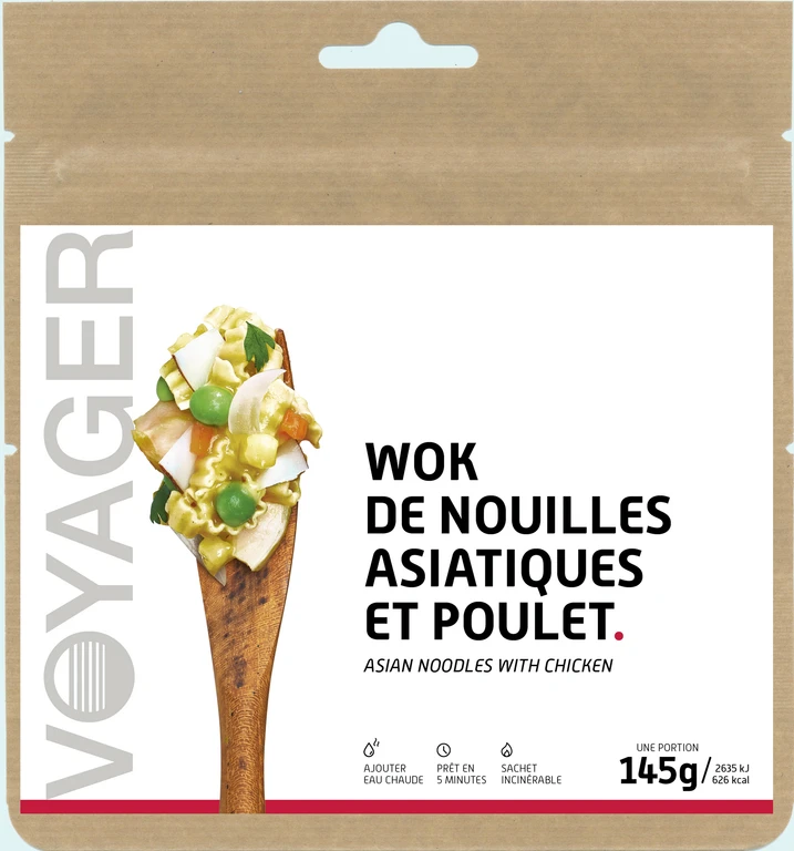 Le Wok de nouilles asiatiques et poulet de Voyager est un plat lyophilisĂ©, aux saveurs d’Asie. C’est l’association de tendres morceaux de poulet, de lĂ©gumes craquants et de nouilles.